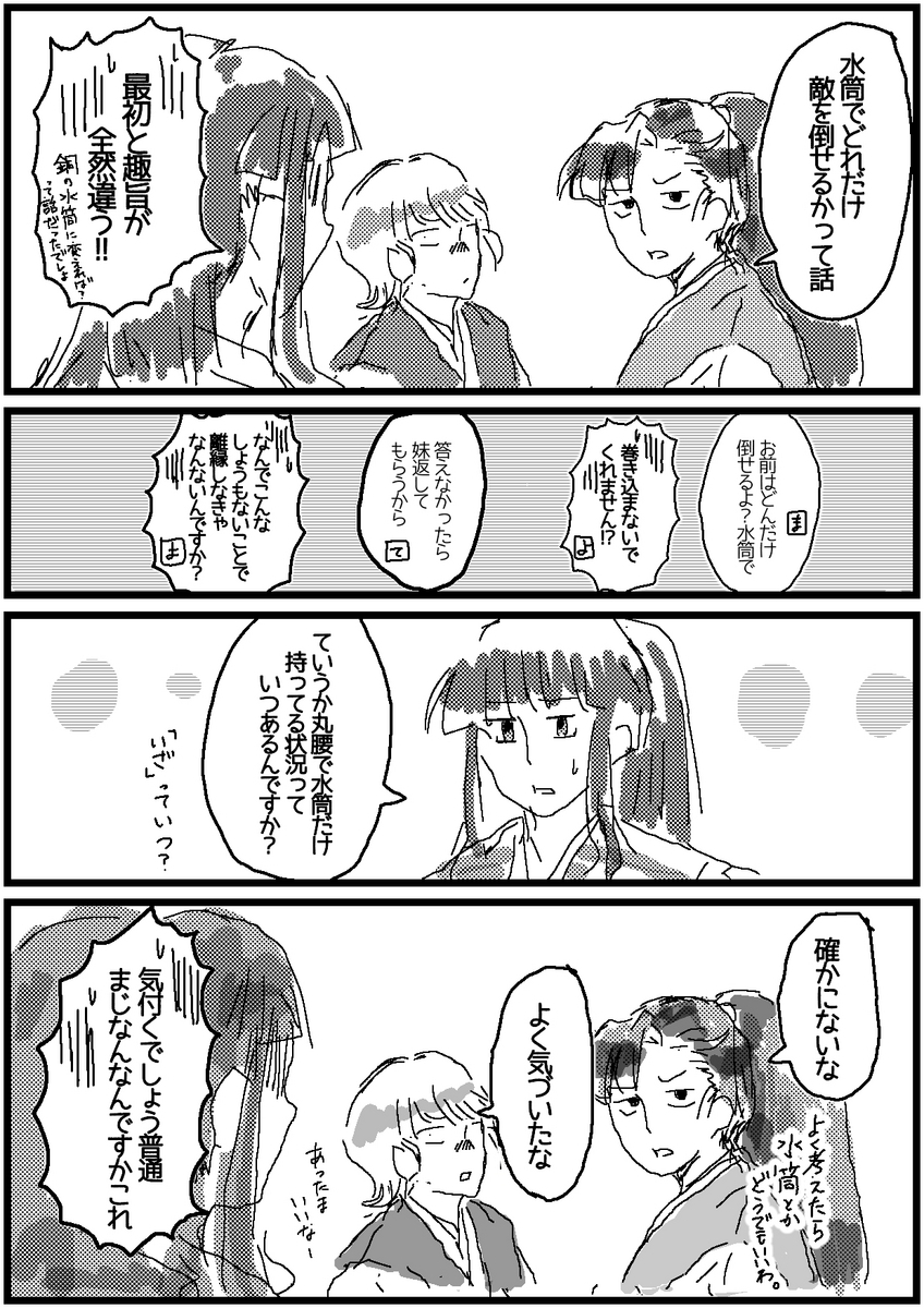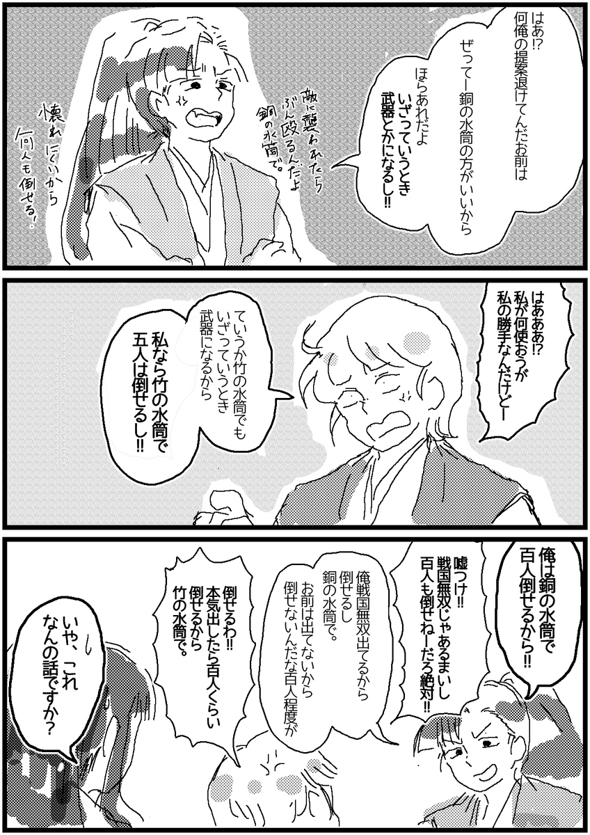 銅の水筒って勝手に重いやつを想像したんですが全て描き終えた後にいや銅の水筒ってホントに重いの?と思ってしまい画像検索したけどなんか軽そうでした。全て描き終えてしまったのでもったいないから投稿します。相変わらず意味わからん漫画で申し訳無い。